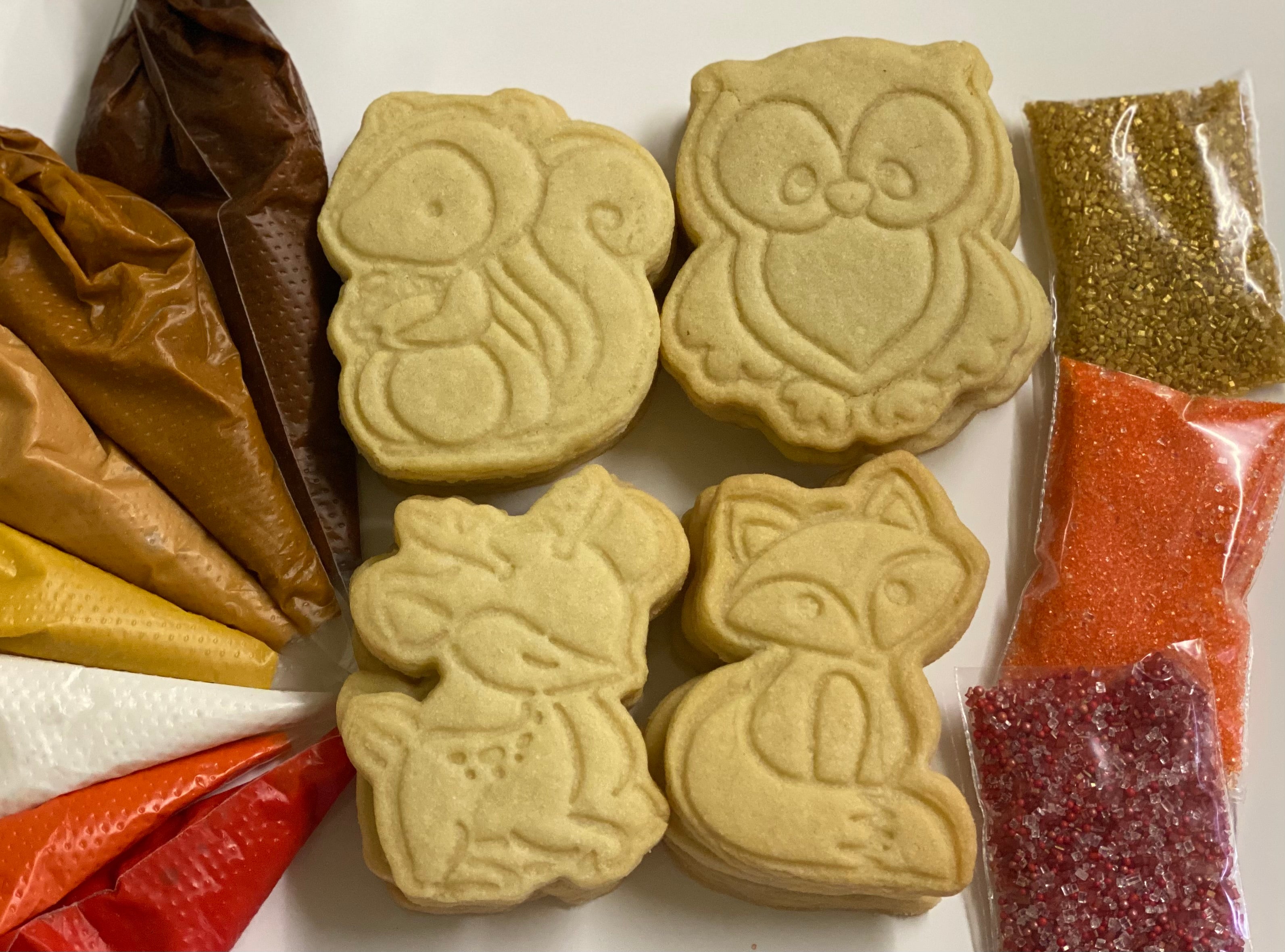 Our standard $50 decorate your own WOODLAND CREATURES Cookie Kit comes with 7 bags of icing, 3 baggies of sprinkles and 1 dozen of our old fashioned sugar cookies: 3 squirrels, 3 foxes, 3 owls & 3 deer.