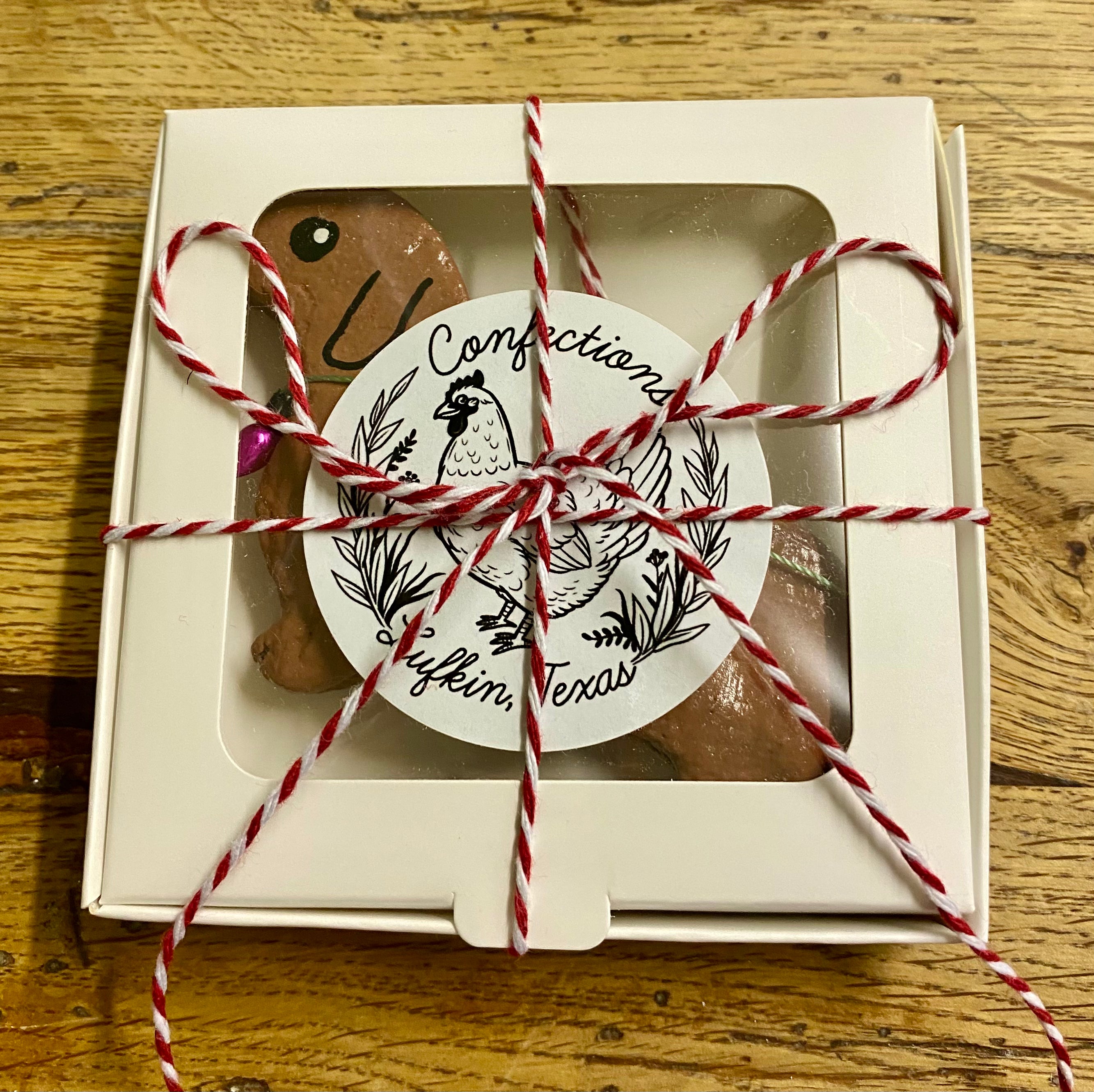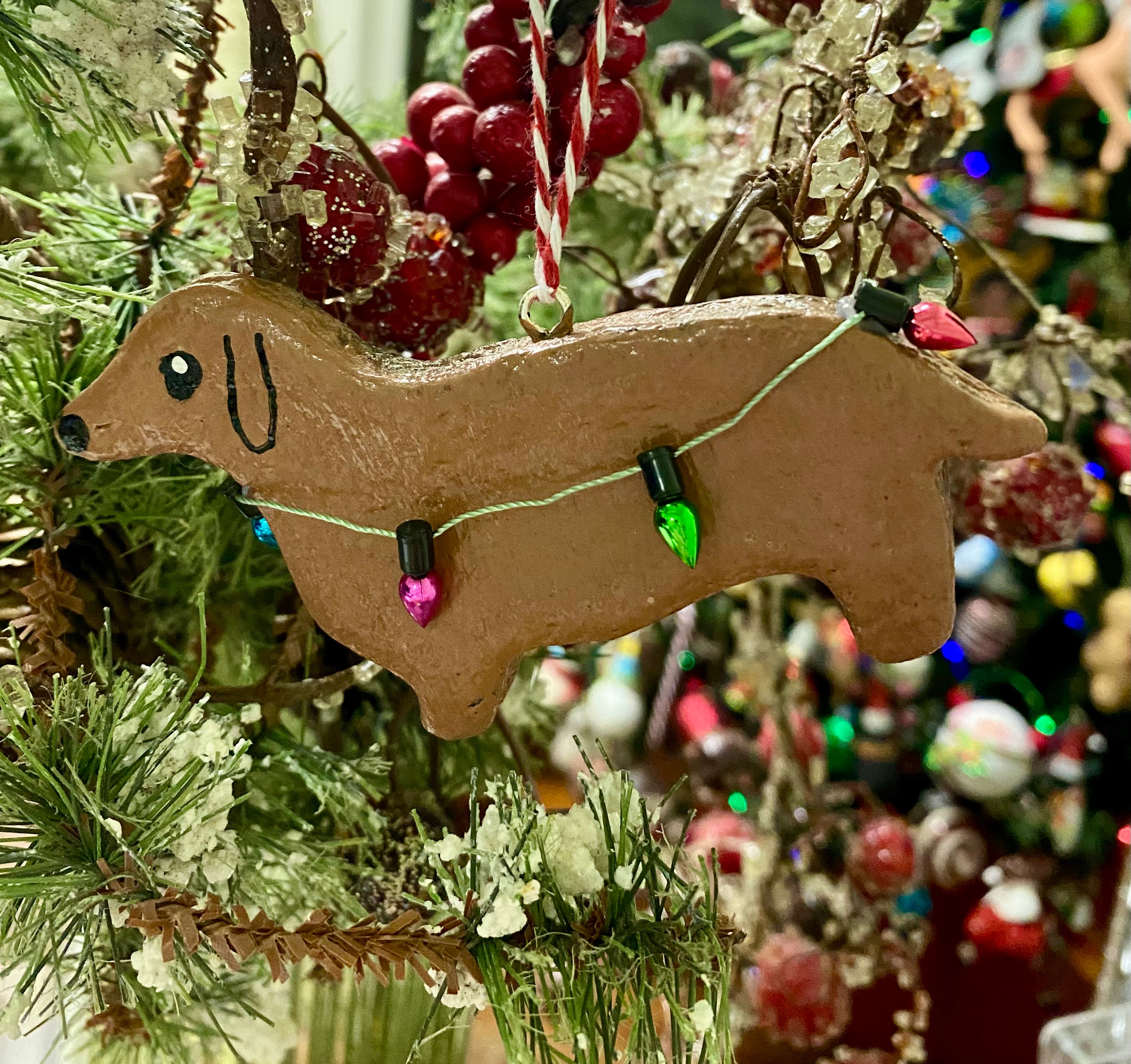 This festive dachshund ornament is made from salt dough & bedecked with decorative holiday lights! It is rolled out and goes into the oven to bake for six hours. When it comes out, it air dries for two days and then is hand painted with several coats of acrylic paint, front and back and sealed. Each ornament comes in its own little box wrapped with Baker’s twine and measures roughly 4.5 x 2.5 inches and is made with so much love and positivity!