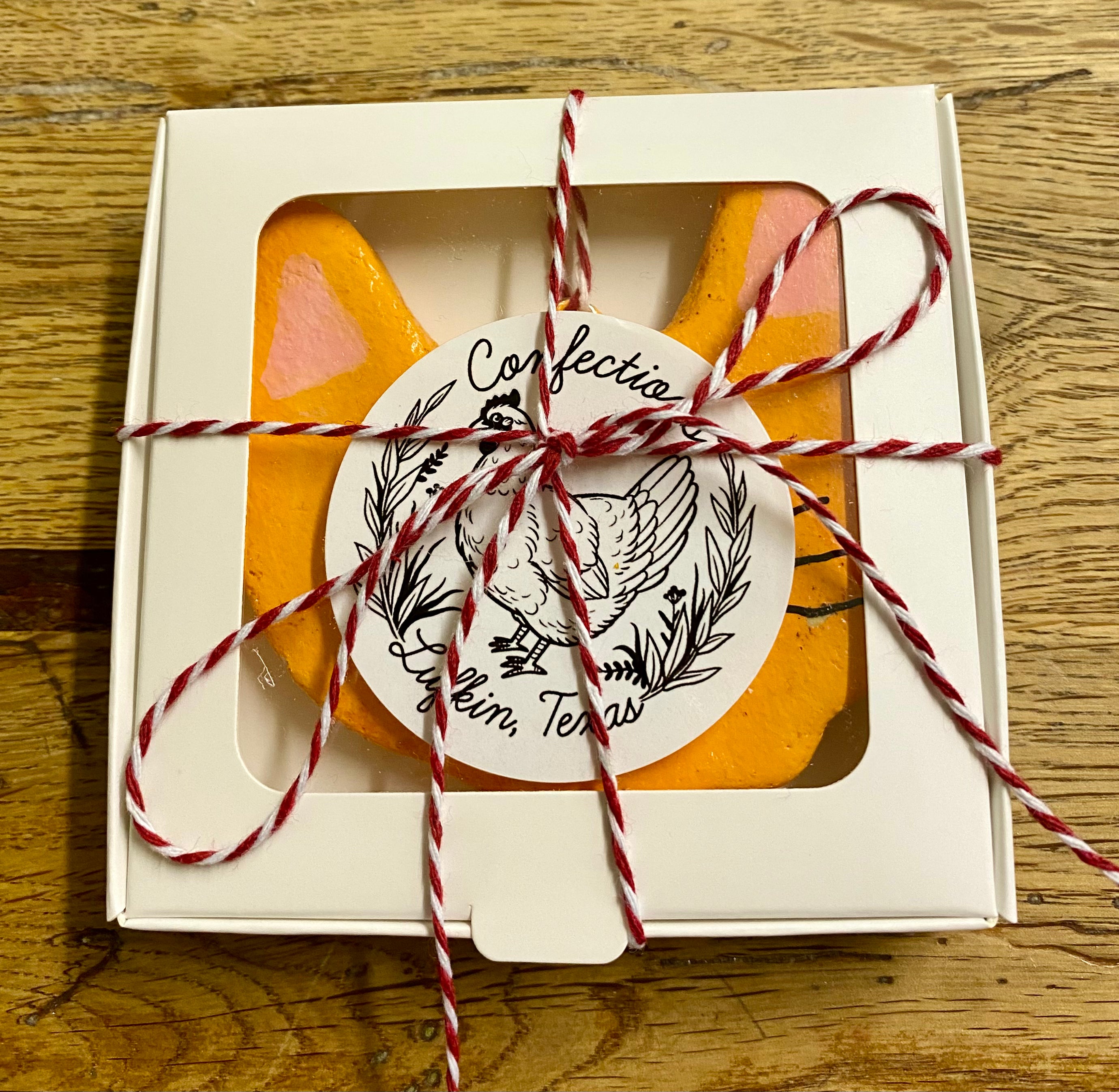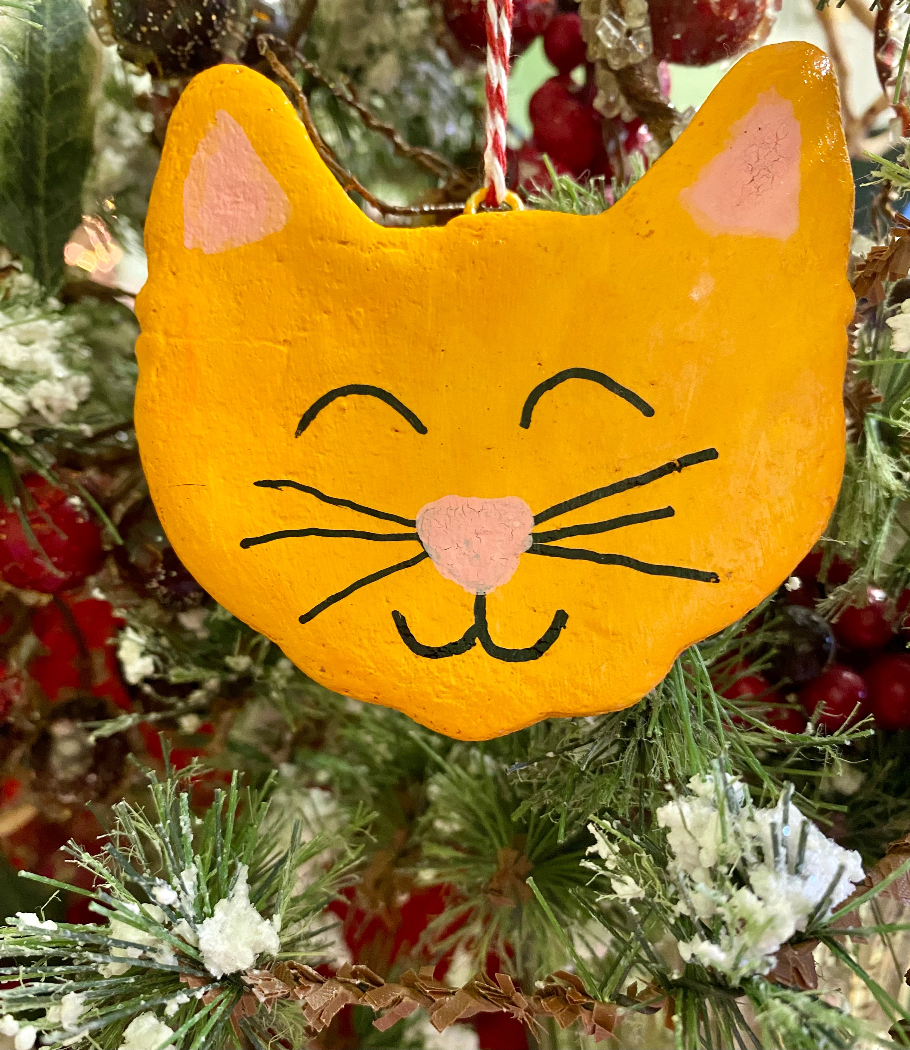 This charmingly sassy cat face ornament is made from salt dough! It is rolled out and goes into the oven to bake for six hours. When it comes out, it air dries for two days and then is hand painted with several coats of acrylic paint, front and back and sealed. Each ornament comes in its own little box wrapped with Baker’s twine and measures roughly 3 x 2.5 inches and is made with so much love and positivity!
