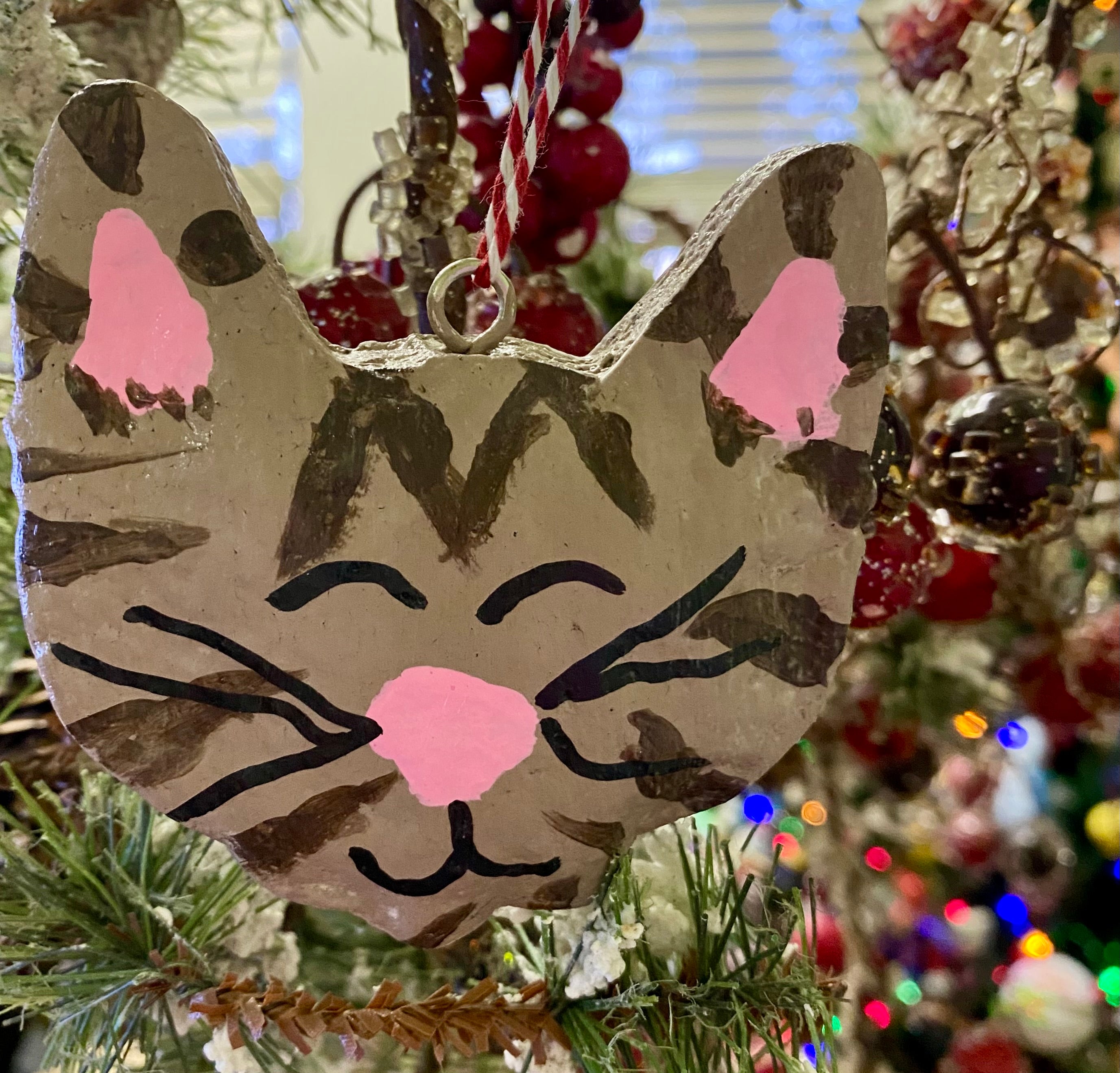 This charmingly sassy cat face ornament is made from salt dough! It is rolled out and goes into the oven to bake for six hours. When it comes out, it air dries for two days and then is hand painted with several coats of acrylic paint, front and back and sealed. Each ornament comes in its own little box wrapped with Baker’s twine and measures roughly 3 x 2.5 inches and is made with so much love and positivity!